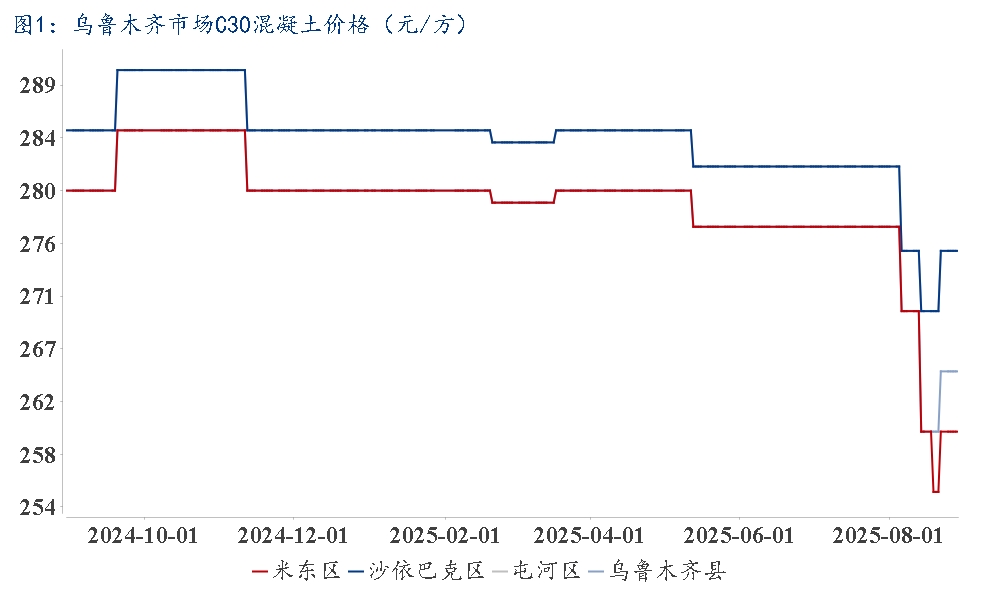 8月29日,烏魯木齊市場C30混凝土均價為265元/方,周變化平,環(huán)比平,同比跌7.02%。